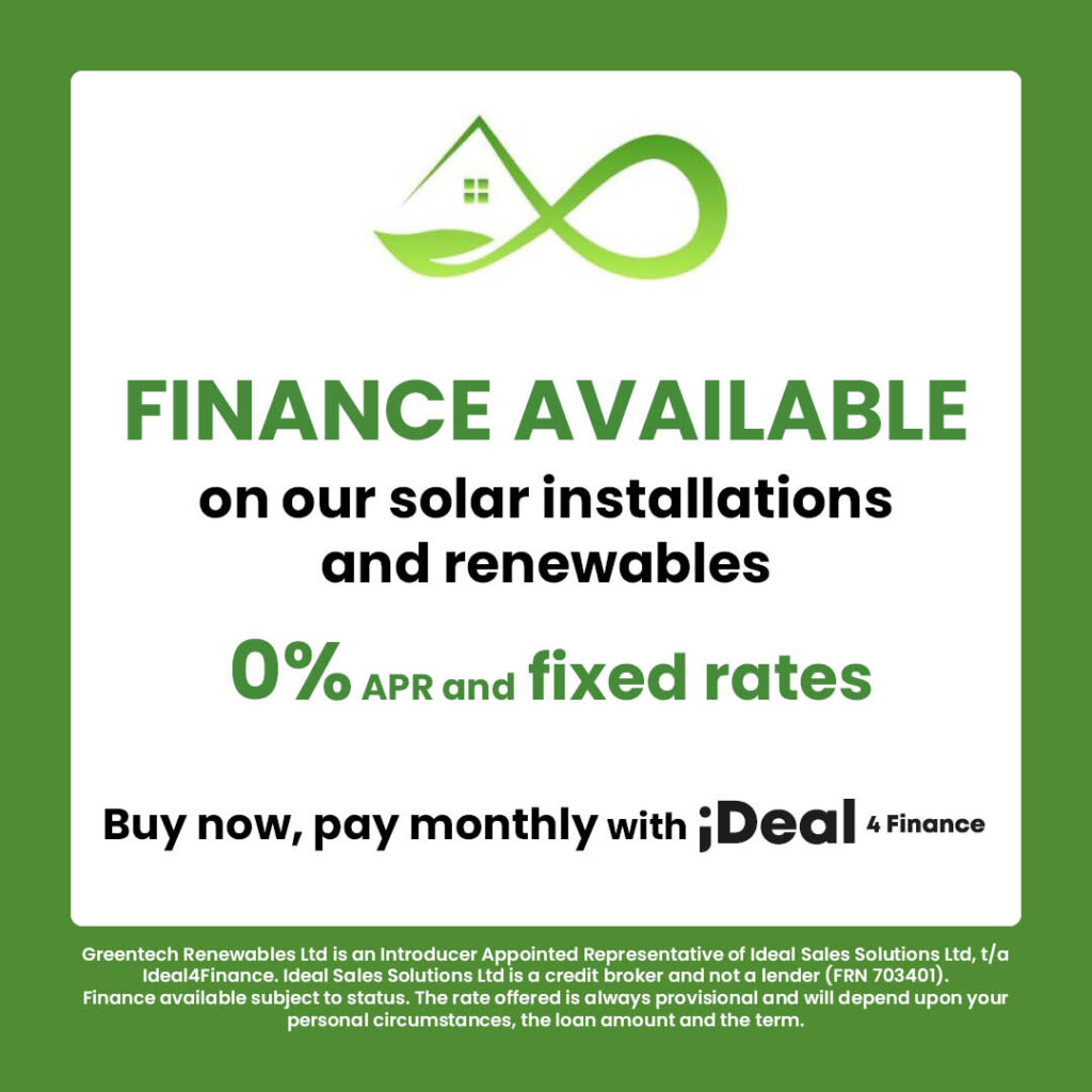 Greentech Renewables Ltd is an Introducer Appointed Representative of Ideal Sales Solutions Ltd, t/a Ideal4Finance. Ideal Sales Solutions Ltd is a credit broker and not a lender (FRN 703401). Finance available subject to status. The rate offered is always provisional and will depend upon your personal circumstances, the loan amount and the term.